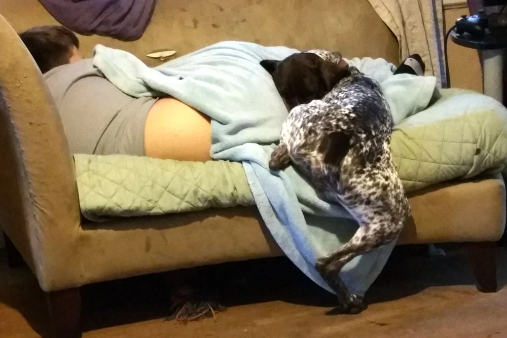 Thor Thunder Puppy is THE most loving dog I have ever known! His "daddy," has taught him to greet him with his front paws on his shoulders like a hug! Thor is soon to see the Dr to get cut, mostly to calm him down. He sees himself of Lord Protector of the family. Here's a picture of him watching over his dad a few hours after having 4 wisdom teeth extracted. Thor did not leave his side.